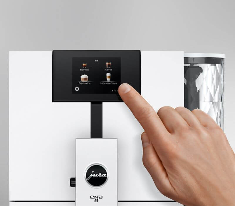 Obsługa ekspresu do kawy JURA ENA 8 jest banalnie prosta, a to wszystko za sprawą dotykowego i bardzo intuicyjnego ekranu. Pojawiające się komunikaty intuicyjnie prowadzą nas przez wszystkie etapy od ustawień, przez przygotowanie kawy po programy konserwacyjne.